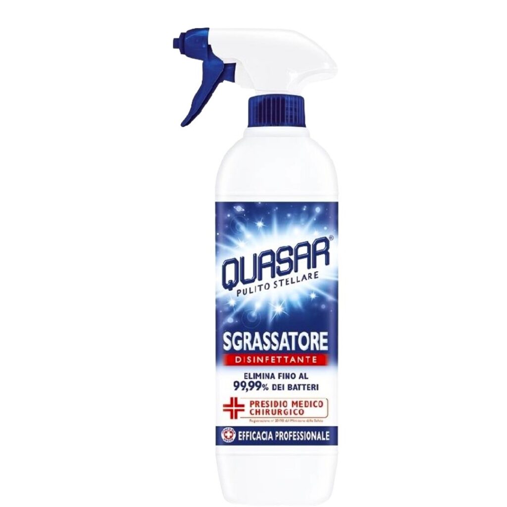 Otkrij snagu Quasar Sgrassatore Disinfettante – višenamjenskog profesionalnog spreja koji uklanja i najtvrdokorniju masnoću i prljavštinu, dok istovremeno uništava 99,99% bakterija i klica. Idealan je za kuhinje, kupaonice i sve površine koje zahtijevaju maksimalnu čistoću i dezinfekciju.